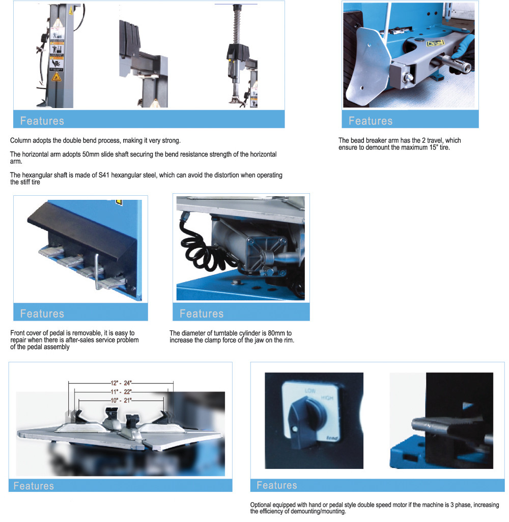 1) O cambiador automático do pneu, a inclinação para trás e para a frente da coluna e do fechamento da coluna podem ser terminados pneumaticamente.