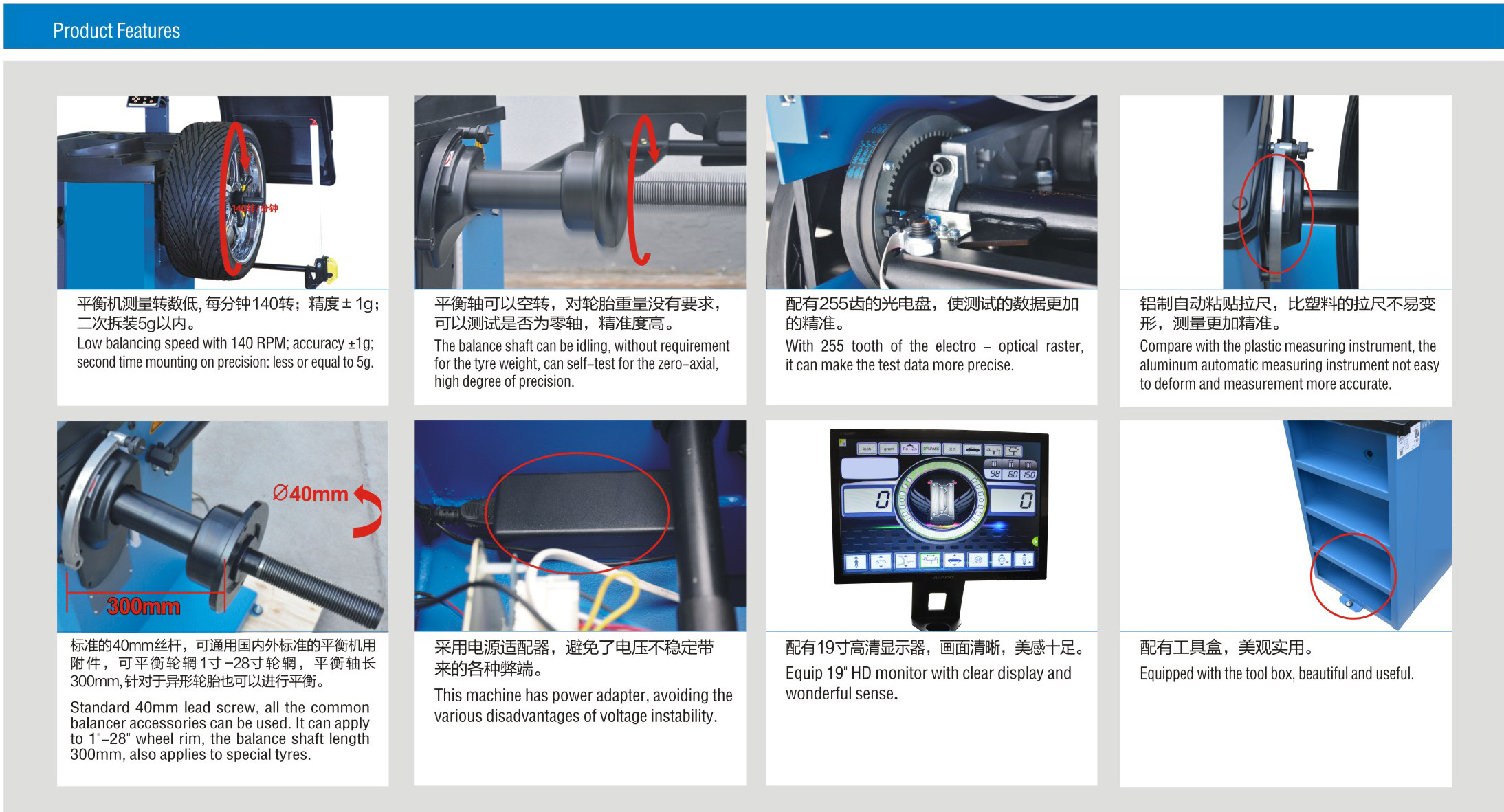 5. o parafuso movimentador do padrão 40mm, todos os acessórios comuns do equilibrador pode ser usado. Pode aplicar-se à borda da roda da polegada 1-28, o comprimento 300mm do eixo do equilíbrio, igualmente aplica-se aos pneumáticos especiais.